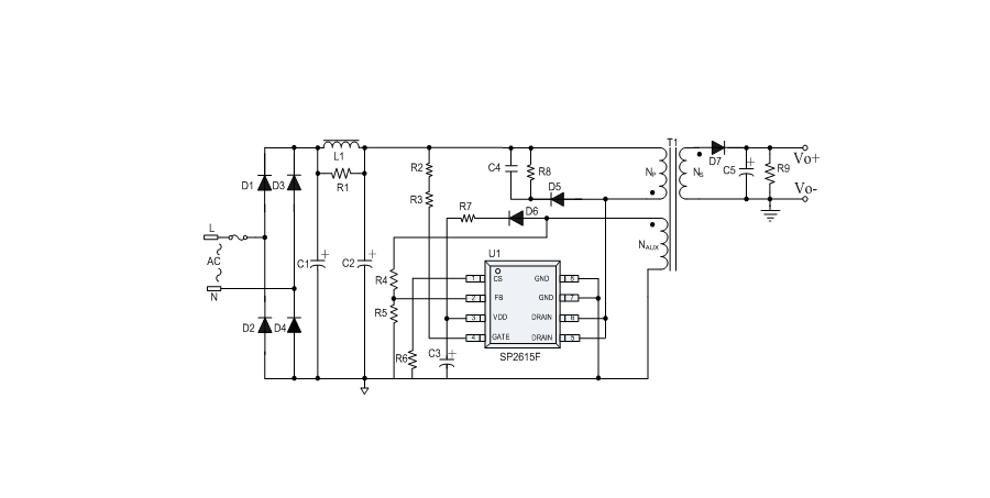 SP2615F是一款性能優(yōu)異的原邊反饋控制電路,應(yīng)用于小功率AC/DC充電器與適配器。控制電路使用原邊采樣技術(shù)進(jìn)行精確的恒流、恒壓控制,可以省去一般應(yīng)用中的光耦與TL431。