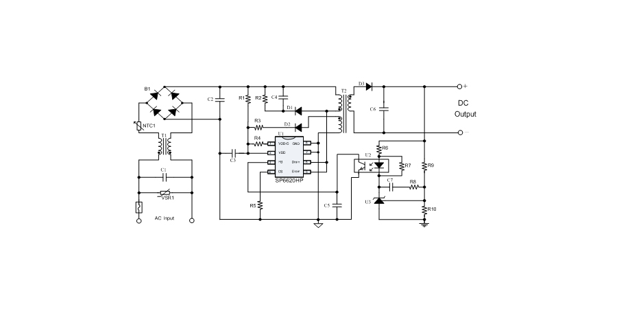SP6620HP在PWM模式下工作于固定頻率,這個頻率是由內(nèi)部精確設定的。在空載或者輕載時,工作頻率由IC內(nèi)部調(diào)整。芯片可以工作在綠色模式,以此來減小輕載時的損耗,提高整機的工作效率,SP6620HP在啟動和工作時只需要很小的電流,可以在啟動電路中使用一個很大的電阻,以此來進一步減小待機時的功耗。芯片內(nèi)置有斜坡補償電路,當電路工作于大占空比時,避免次諧波振蕩的發(fā)生,改善系統(tǒng)的穩(wěn)定性。內(nèi)置有前沿消隱時(Leading-edge blanking time),消除緩沖網(wǎng)絡中的二極管反向恢復電流對電路的影響。SP6620HP采用了抖頻技術,能夠有效改善系統(tǒng)的EMI性能。系統(tǒng)的跳頻頻率設置在音頻(20KHz)以上,在工作時可以避免系統(tǒng)產(chǎn)生噪音。SP6620HP內(nèi)置多種保護,包括逐周期限流保護(OCP),過載保護(OLP),過壓保護(OVP),VDD過壓箝位,欠壓保護(UVLO),過溫保護(OTP)等,通過內(nèi)部的圖騰柱驅(qū)動結構可以更好的改善系統(tǒng)的EMI特性和開關的軟啟動控制。SP6620HP使用DIP8無鉛封裝。