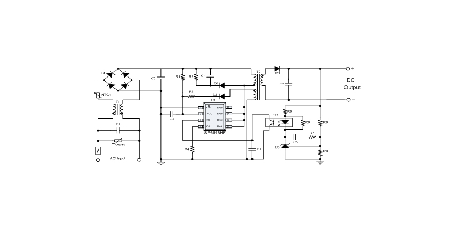 SP6648HF是一顆電流模式PWM控制芯片,內(nèi)置650V高壓功率MOSFET,應(yīng)用于功率在18W以內(nèi)的方案。SP6648HF在PWM模式下工作于固定開關(guān)頻率,這個頻率是由內(nèi)部精確設(shè)定。在空載或者輕載時,工作頻率由IC內(nèi)部調(diào)整。芯片可以工作在綠色模式,以此來減小輕載時的損耗,提高整機的工作效率。SP6648HF在啟動和工作時只需要很小的電流,可以在啟動電路中使用一個很大的電阻,以此來進一步減小待機時的功耗。芯片內(nèi)置有斜坡補償電路,當(dāng)電路工作于大占空比時,避免次諧波振蕩的發(fā)生,改善系統(tǒng)的穩(wěn)定性。內(nèi)置有前沿消隱時(Leading-edge blanking time),消除緩沖網(wǎng)絡(luò)中的二極管反向恢復(fù)電流對電路的影響。SP6648HF采用了抖頻技術(shù),能夠有效改善系統(tǒng)的EMI性能。系統(tǒng)的跳頻頻率設(shè)置在音頻(22KHz)以上,在工作時可以避免系統(tǒng)產(chǎn)生噪音。SP6648HF內(nèi)置多種保護,包括逐周期限流保護(OCP),過載保護(OLP),過壓保護(VDD OVP),VDD過壓箝位,欠壓保護(UVLO),過溫保護(OTP)等,通過內(nèi)部的圖騰柱驅(qū)動結(jié)構(gòu)可以更好的改善系統(tǒng)的EMI特性和開關(guān)的軟啟動控制。