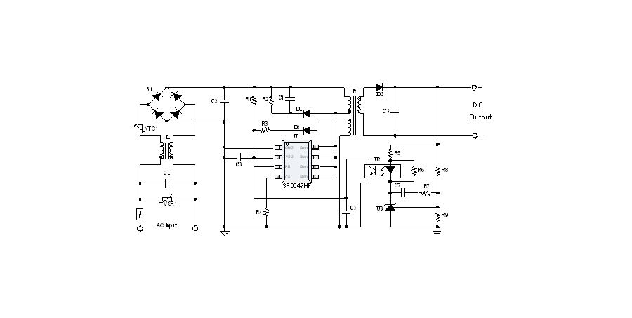 SP6647HF是一顆電流模式PWM控制芯片,內置650V高壓功率MOSFET,應用于功率在15W以內的方案。SP6647HF在PWM模式下工作于固定開關頻率,這個頻率是由內部精確設定。在空載或者輕載時,工作頻率由IC內部調整。芯片可以工作在綠色模式,以此來減小輕載時的損耗,提高整機的工作效率。SP6647HF在啟動和工作時只需要很小的電流,可以在啟動電路中使用一個很大的電阻,以此來進一步減小待機時的功耗。芯片內置有斜坡補償電路,當電路工作于大占空比時,避免次諧波振蕩的發(fā)生,改善系統(tǒng)的穩(wěn)定性。內置有前沿消隱時(Leading-edge blanking time),消除緩沖網絡中的二極管反向恢復電流對電路的影響。SP6647HF采用了抖頻技術,能夠有效改善系統(tǒng)的EMI性能。系統(tǒng)的跳頻頻率設置在音頻(22KHz)以上,在工作時可以避免系統(tǒng)產生噪音。SP6647HF內置多種保護,包括逐周期限流保護(OCP),過載保護(OLP),過壓保護(VDD OVP),VDD過壓箝位,欠壓保護(UVLO),過溫保護(OTP)等,通過內部的圖騰柱驅動結構可以更好的改善系統(tǒng)的EMI特性和開關的軟啟動控制。