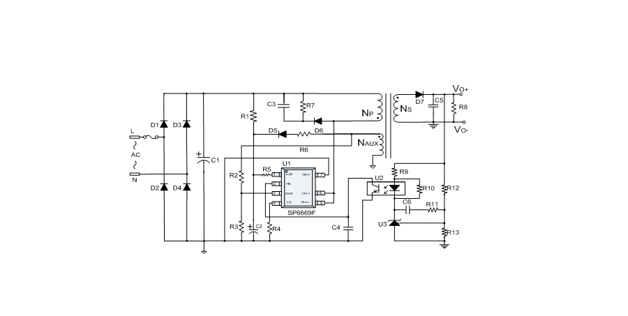 SP6669F內置多種保護,包括:輸入電壓過低保護(Brown-out),輸入電壓過高保護(Line-ovp),輸出電壓過壓保護(VO_OVP),輸出二極管短路保護,逐周期過流保護(OCP),過載保護(OLP),VDD過壓保護(OVP),VDD欠壓保護(UVLO),過溫保護(OTP)等。