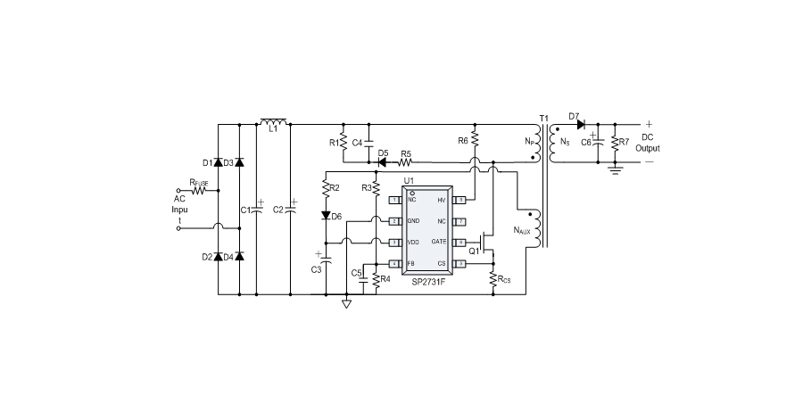 SP2731F是一款性能優(yōu)異的原邊反饋控制電路,應(yīng)用于中、小功率AC/DC充電器與適配器。控制電路使用原邊采樣技術(shù)進行精確的恒流、恒壓控制,可以省去一般應(yīng)用中的光耦與TL431。